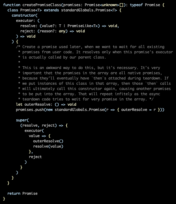This monstrosity is the primary result of today's work. Combined with babel compiling async/await into promises, it lets me run arbitrary user code, then wait for every promise and timer to resolve, regardless of how it was created.