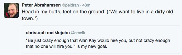 "Be just crazy enough that Alan Kay would hire you, but not crazy enough that no one will hire you." is my new goal.