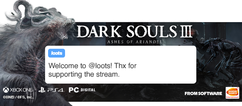 @DarkSoulsGame is coming to@loots with Ashes of Ariandel DLC.@BandaiNamcoEU THANKS for supporting our streamers!pic.twitter.com/9eFRq7SQ3g