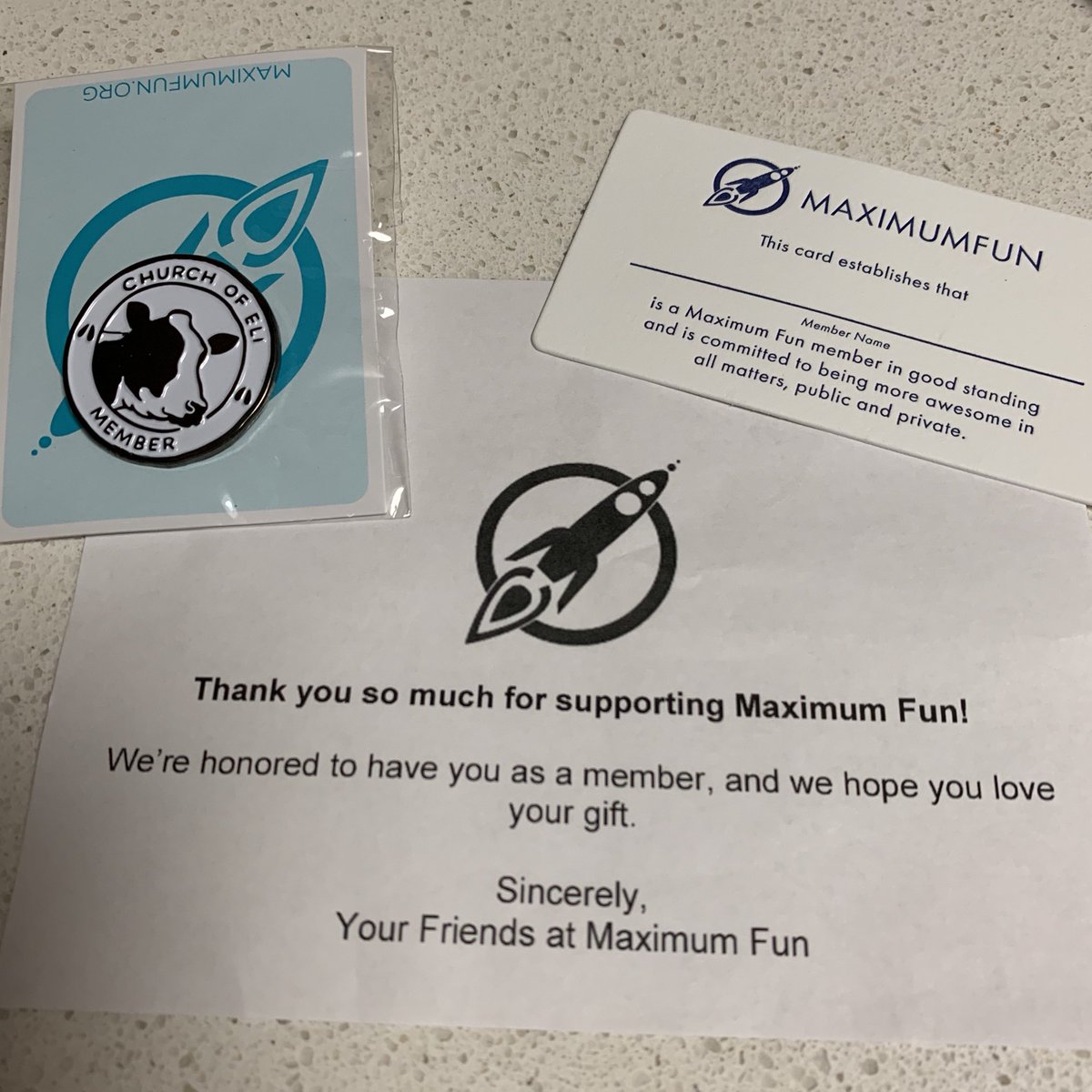 Miffed my care package of fresh rich beef sausages was lost, but delighted to find my exclusive “Church of Eli” pin and coveted