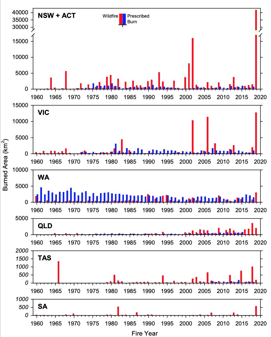 4/n We disaggregated the data by states & territories and separated wildfires from prescribed burns. Notice that hazard reduction fires in Western Australia burn more area than wildfires do. Are prescribed burns keeping wildfires under control?pic.twitter.com/UTgaCJsx4d