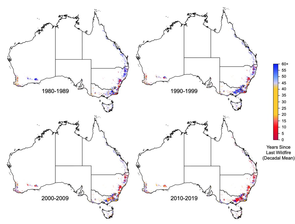 5/n The length of time between fires has rapidly decreased over the past four decades. However, consistent with the previous figure, Western Australia has kept a rather constant fire regime over time. Is it because of the proportionally higher hazard reduction burns?pic.twitter.com/VnsWa904za