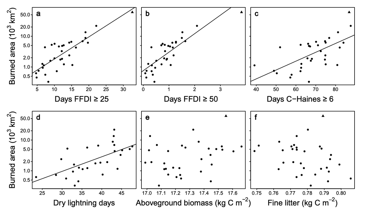 6/n Keeping in mind the limitations of correlation analyses to establish the causal influence of drivers of the observed fire activity, we find strong links between forest burned area & 2 fire weather indices affected by climate change, but not with modelled biomass/fuel loadspic.twitter.com/7EN1l417gb