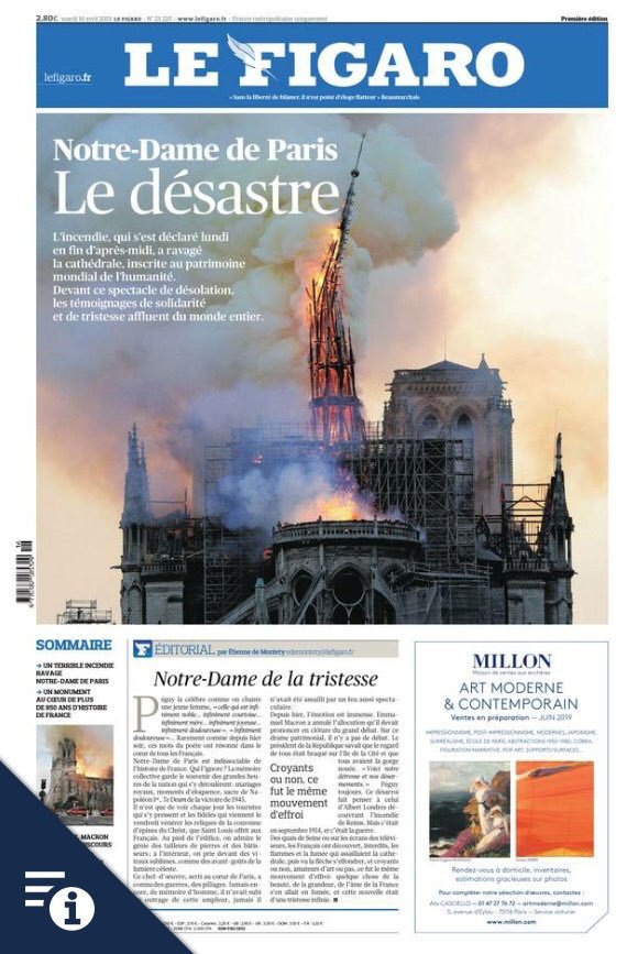 Como apunta @Newtral así abrirá la prensa francesa mañana. Aquí os dejo las portadas de Libération, Le Figaro, Le Parisien y Les Echos. #NotreDamepic.twitter.com/nz46dJDqaF