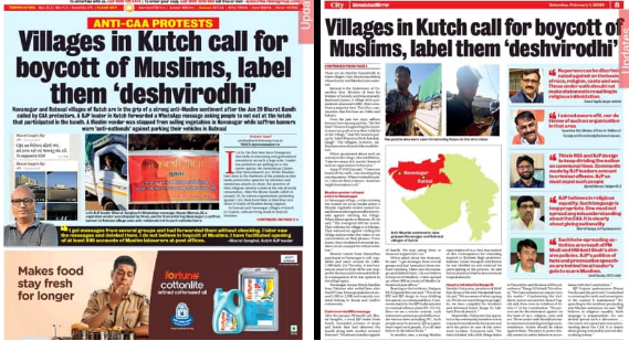 Unfortunate. A report in Ahmedabad Mirror about Kutch villages. It tells about boycott calls, BJP leader's message asking people not to eat at hotels that supported bandh, Muslim vendor stopped from selling vegetables in Navanagar & banner that bars parking of vehicles