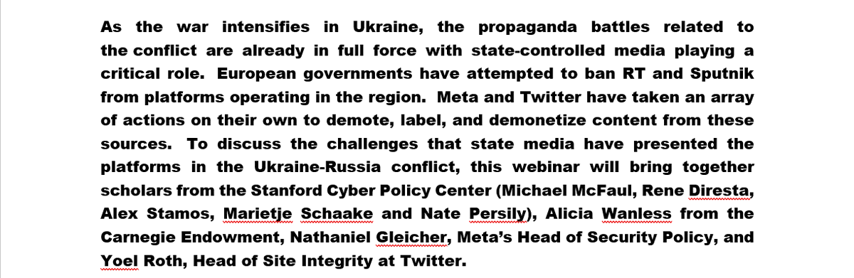 Tomorrow (3/4) @ 2 PM PDT, 5 PM EDT, Stanford Cyber Policy webinar on "State Media, Social Media, and the Conflict in Ukraine" Speakers include Alex @stamos, Rene DiResta@noUpside & Facebook Security Policy Head Nathaniel@ngleicher