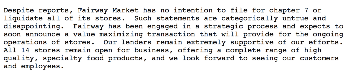 New —> FAIRWAY, the iconic NYC supermarket, says it has NO intention of filing for bankruptcy or closing stores. Disputing today’s report in the NYPost.pic.twitter.com/lTpgXS4Q2l