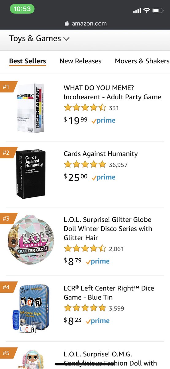 @INCOHEARENTgame officially the #1 Toy & Game on amazon!!! WOWowowow thank u so much to everyone who’s supported, bought a copy, shared w friends/fam, + of course to my partners in crime@javierofficial@Whatdoyoumeme@fuckjerry