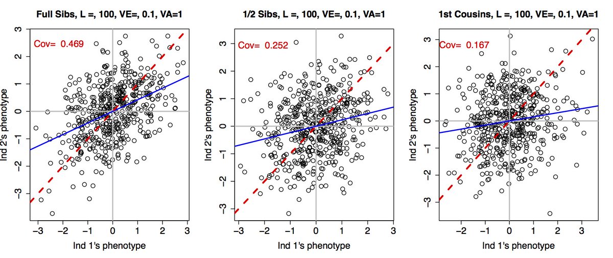 Figure & Code for showing Phenotypic covariance between relatives, how covar drops off w. degree of relatedness https://github.com/cooplab/popgen-notes/blob/master/Rcode/QT4.R …pic.twitter.com/SWCisHdssT