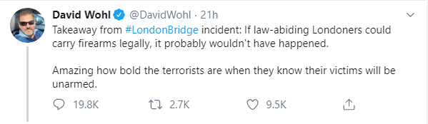 Terrorist: *get's taken out by a narwhal tusk and a fire extinguisher* Nobody: Literally No one: This Idiot: "we should give everyone guns"pic.twitter.com/ECkBgps752