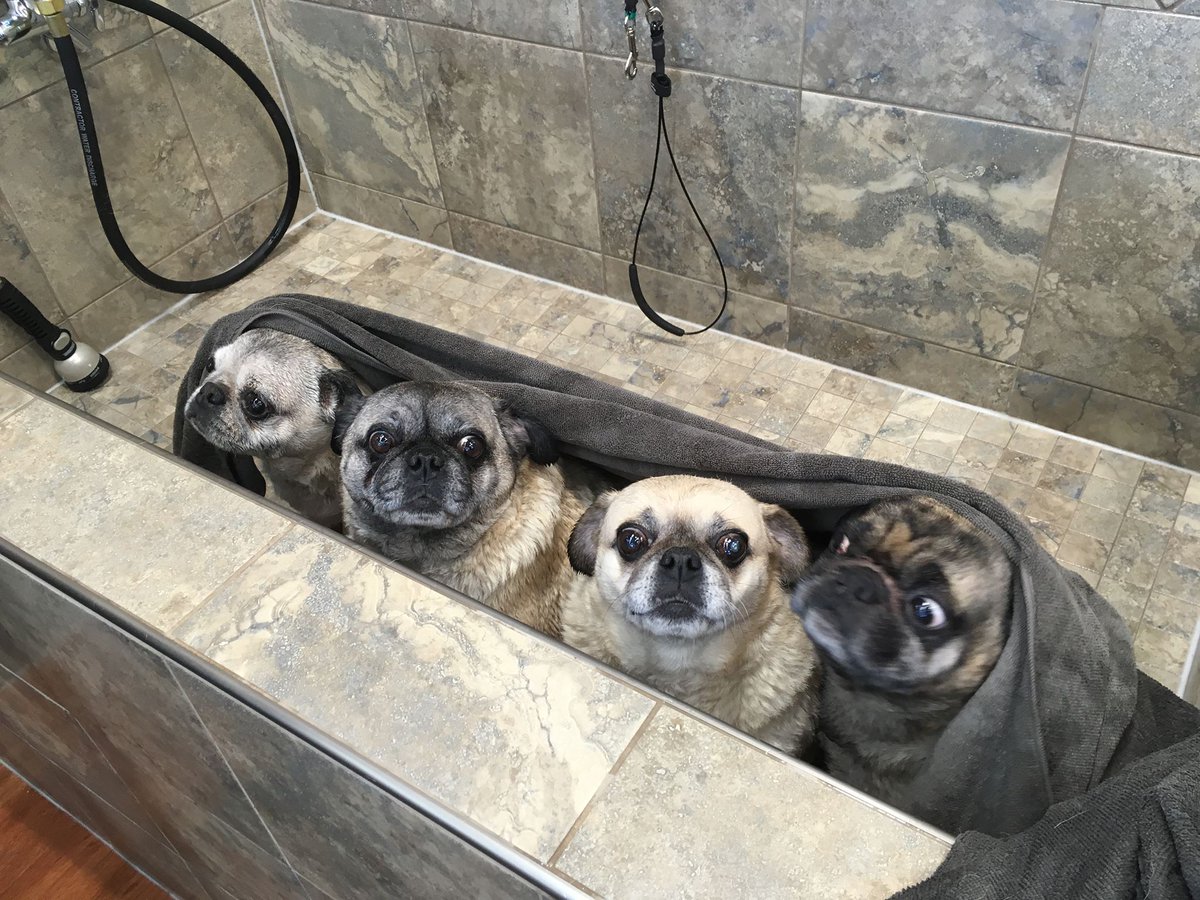 Rub-a-dub-dub, four pugs in a tub! this #cutecustomeralert courtesy of Pet Valu Trenton.pic.twitter.com/qjb4dv771R
