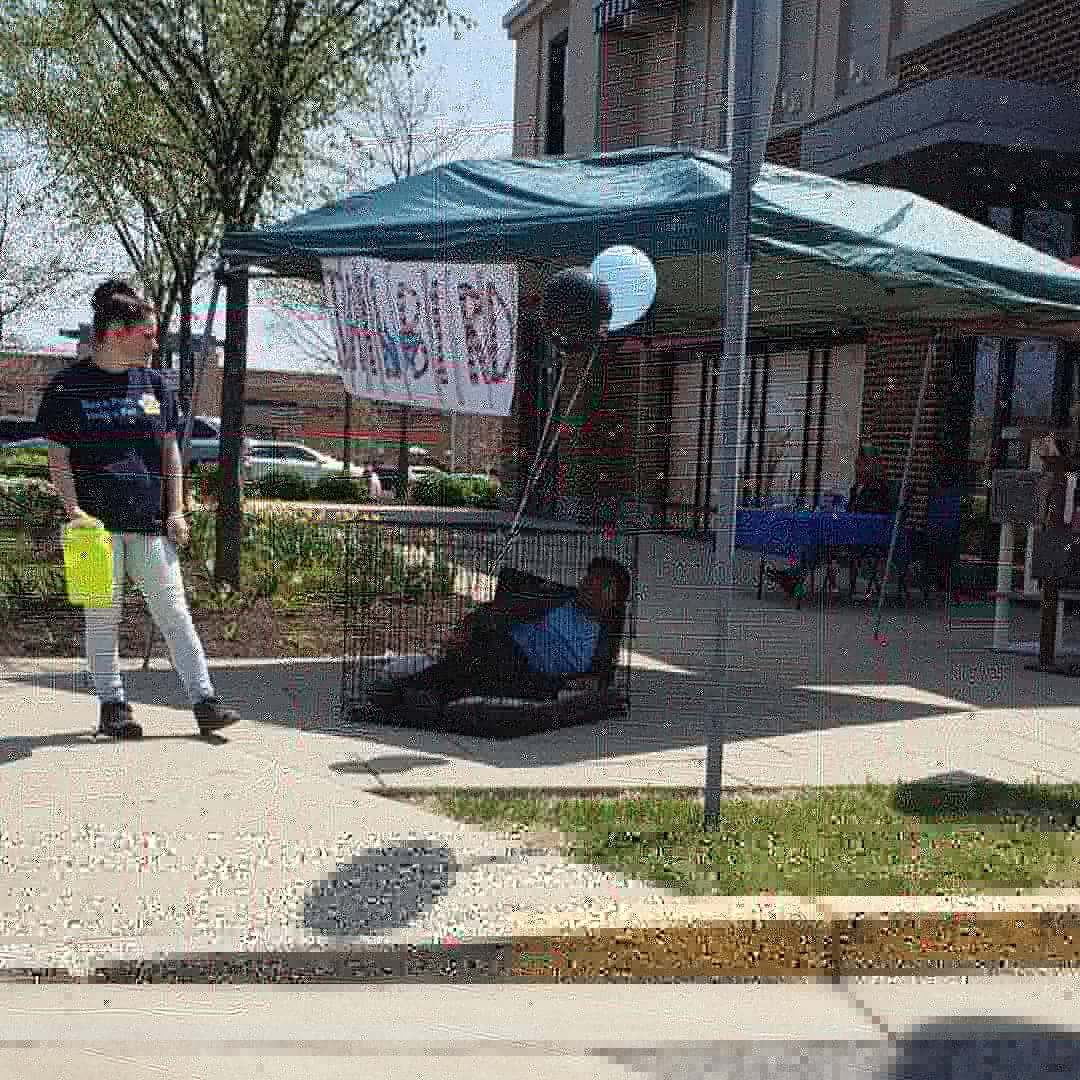 What is seen here is a fundraiser where team members spend time in the crate to help raise money for local pet rescues. We apologize. The team did not mean to offend anyone and the district manager will discuss this with them.