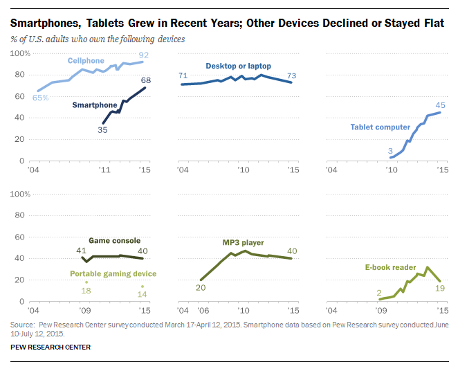 NEW: Technology Device Ownership 2015 - 68% of Americans have smartphone, 45% have tablets http://pewrsr.ch/1GyFf76 pic.twitter.com/P5jWPbUamV