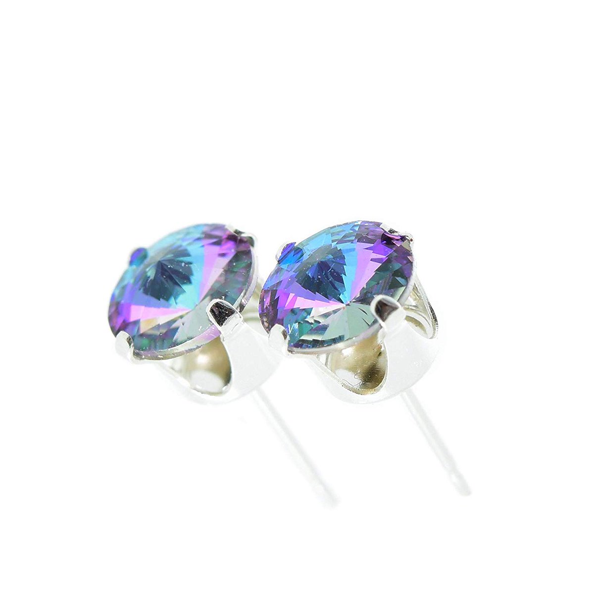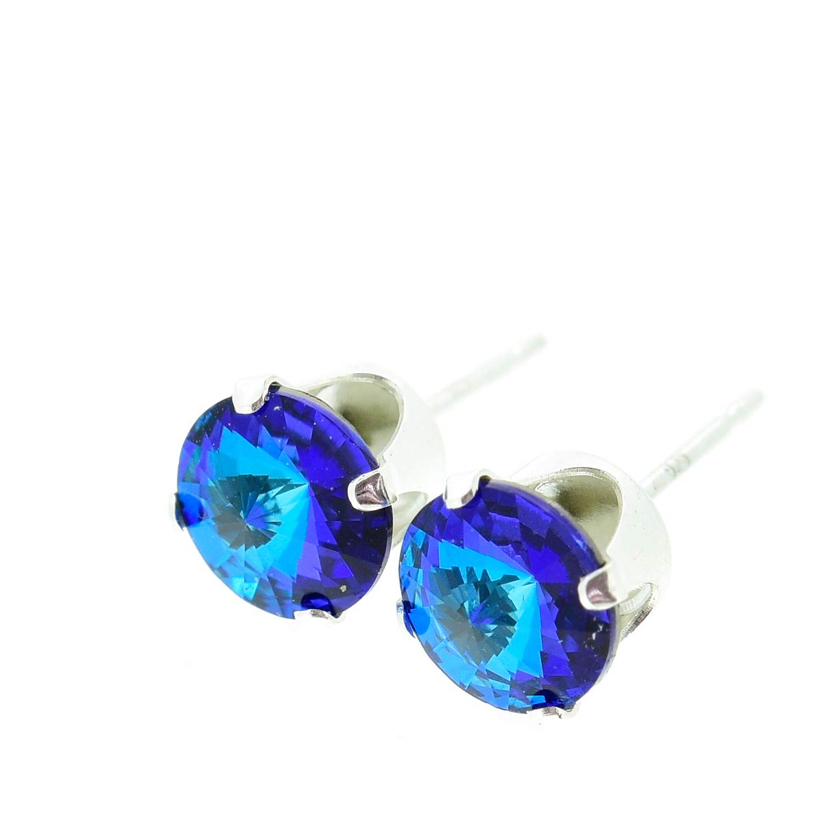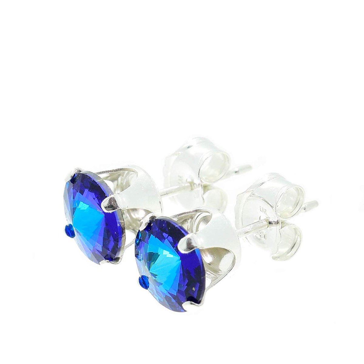 Pewterhooter 8mm silver Sterling Silver earrings for women made with Bermuda Blue crystal from Swarovski®.