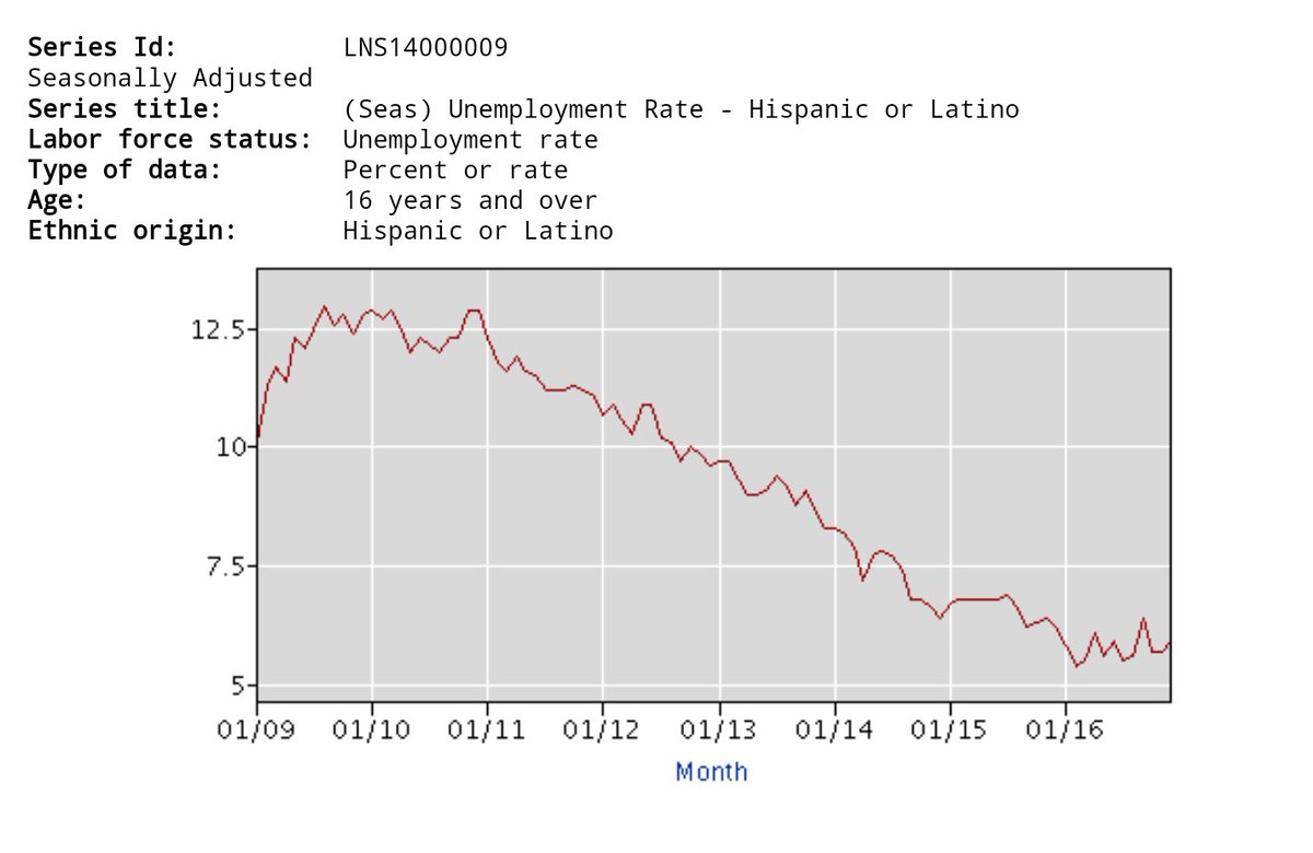 This is what happens to Hispanic Unemployment under liberal policy. Same thing for blacks, whites, Asians, men, women. By all means go try and find a group other than the rich who does better under conservative policy.pic.twitter.com/UVTiF4rcw0