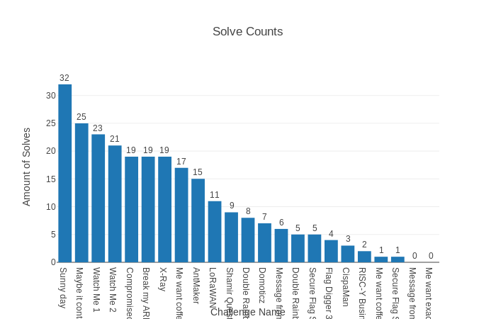 CTF challenge solves at ph0wn: - Most flagged rookie: Sunny Day - Less flagged rookie: X-Ray - Most flagged master: Watch Me 2 - Flagged 3 times or less: CispaMan, RISC-Y business, Me Want Coffee 2, Secure Flag Storage 2 - Never flagged: Message from Pauline 2, Me Want 90mLpic.twitter.com/KjqCl12ebu