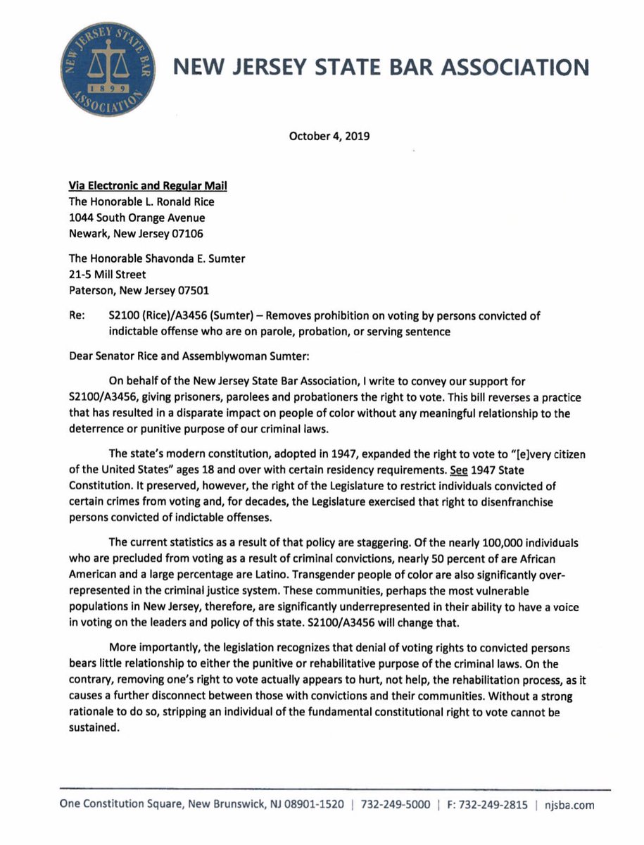 ! The New Jersey Bar Association endorses legislation to entirely abolish felony disenfranchisement, and enable all citizens to vote including from prison. It cites the major, major racial disparities in the state of NJ.https://twitter.com/RyanPHaygood/status/1180910745233629184 …