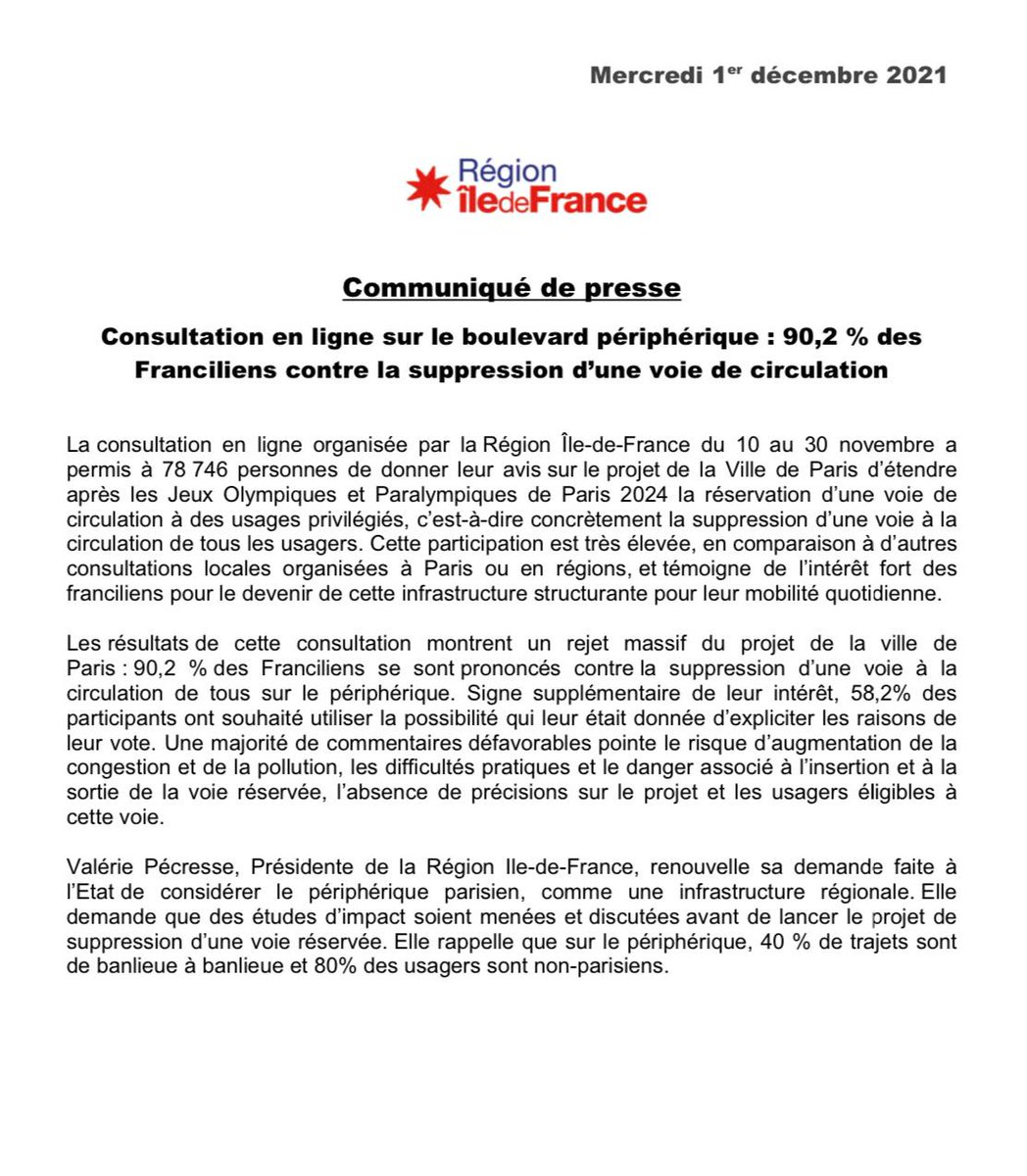 Le résultat est net ! Le périphérique appartient à tous les Franciliens, faisons en sorte que son avenir soit débattu au niveau régional. C'est dans l'intérêt de toutes les villes de petite couronne également !