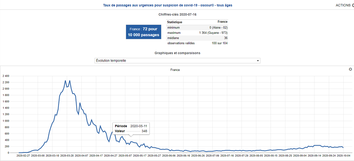 Taux de passages aux urgences pour suspicion de covid-19. Source : geodes.santepubliquefrance Comparaison avec le 11 mai 2020, jour du déconfinement. Le 11/05/2020, taux de 348 Le 04/10/2020, taux de 152 Différence : -56.3% Conclusion : Pas de seconde vague.pic.twitter.com/6DDTSj4YiC