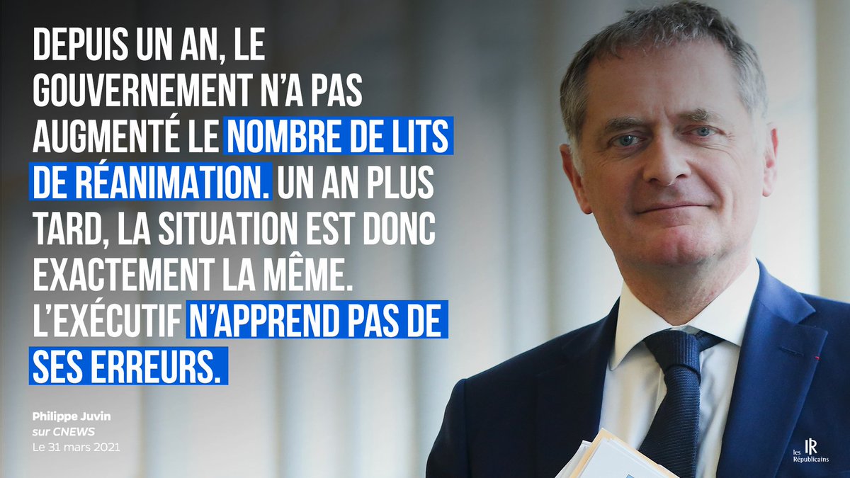 Depuis un an, le #gouvernement n’a pas augmenté le nombre de lits de réanimation. Un an plus tard, la situation est donc exactement la même. L’exécutif n’apprend pas de ses erreurs. 📺 @philippejuvin sur @CNEWS 🇫🇷 #JeRejoinsLR ➡️ http://www.republicains.fr  pic.twitter.com/r2Gsi6bg3Q