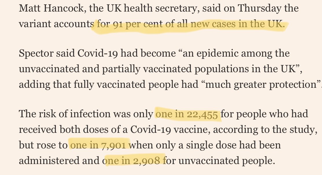 donc sur 1 000 000 de personnes, 344 infectés chez les non vaccinés, 127 chez les vaccinés 1 dose (soit 63% de moins) et 45 chez les vaccinés 2 doses soit 87% de moins: les vaccins semblent rester très efficaces contre delta indeed !