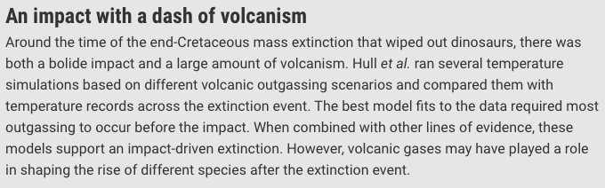 Researchers who analyzed well-preserved ocean drilling and global temperature records have added support to the idea that the primary cause of the Cretaceous-Paleogene mass extinction was an asteroid impact, rather than extreme volcanism. Learn more: ($) https://fcld.ly/g1x7lbx pic.twitter.com/YQ9ndPEIXR