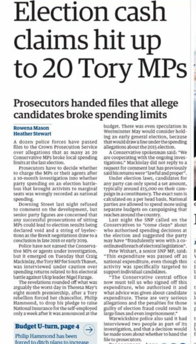 Guardian leads on CON GE2015 election expenses investigation saying 20 MPs could be affectedpic.twitter.com/ya6mbqmqEz