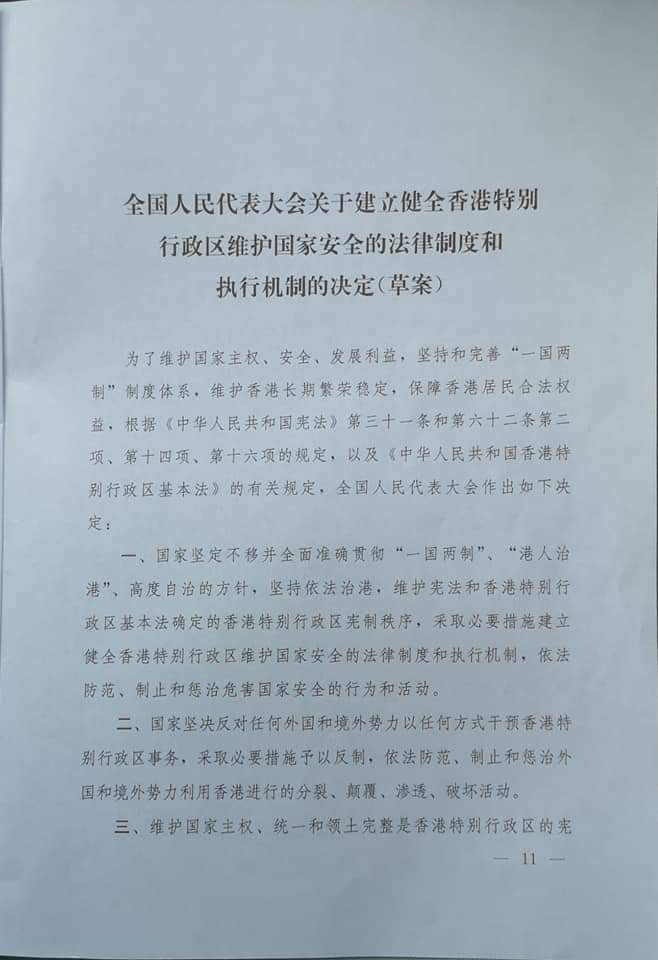 #Breaking thread: Official doc of #HongKong national security law resolution revealed by souces - the new law will prohibit secession, subversion of state power, terrorism & foreign interference. It'll be listed under annex 3 of basic law, bypassing scrutiny of local legislature.pic.twitter.com/nAqX4lenlY