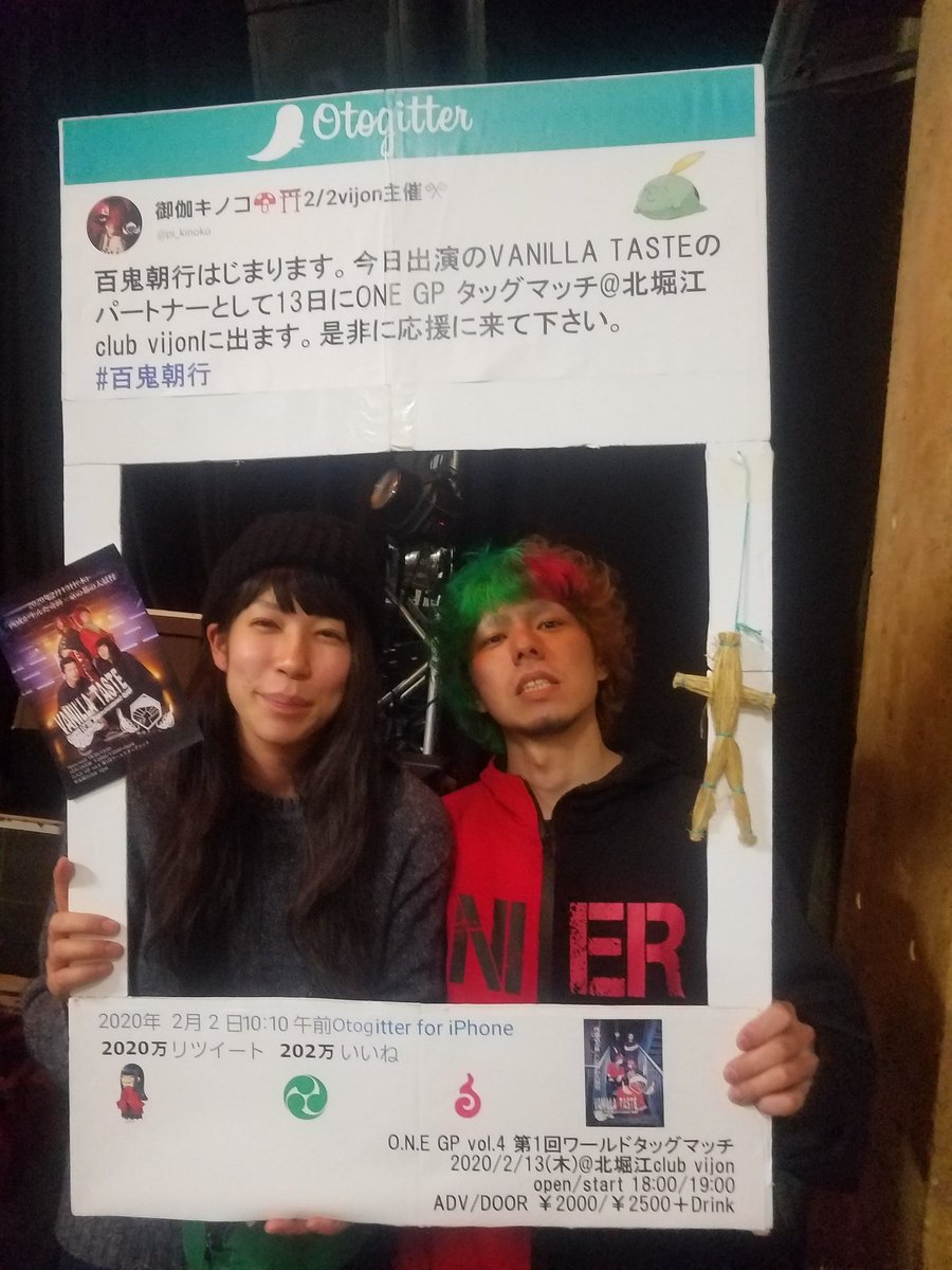 アコースティックバニラ@百鬼朝行ありがとうございましたー! 早朝イベントにも関わらず来てくれた皆様、マジ感謝です! 朝イベントやのにあんな大入りに出来る大妖怪に震えながら楽しくやらせてもらいました! 次回はいよいよタッグマッチ! キノコと共に菱卍なんたらフルボッコにします!pic.twitter.com/WbwQw0TDPX