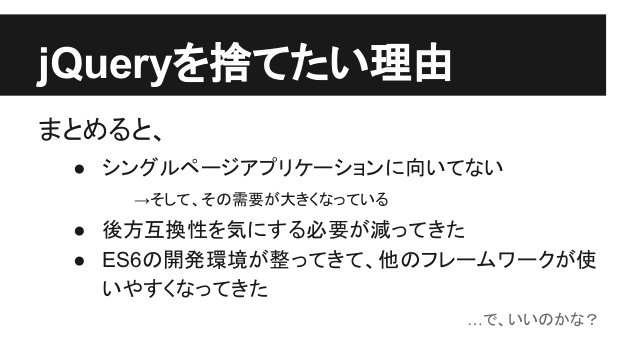 jQueryで書くと、コードが長く冗長になる点と、DOM部分の動的更新時、JSに直接、手を出さなきゃならん危険性(とデザイナーがJSいじるハードルの高さ)について、一目で分かる比較プロト付で