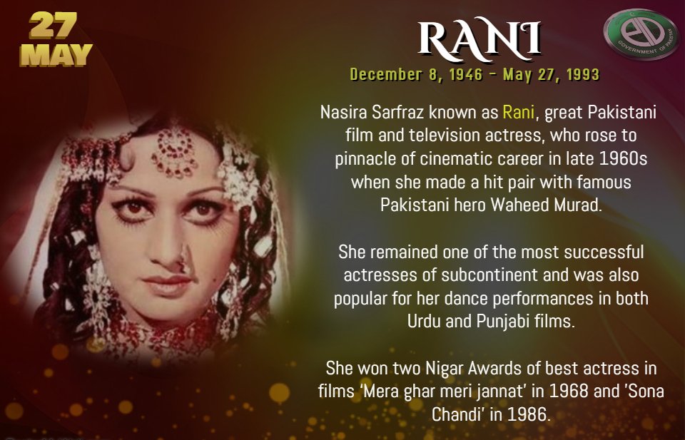 The 25th death anniversary of film actress Nasira Sarfraz known as ‘Rani’ is being observed on May 27. She was a fabulous actor that will always be remembered by her fans.pic.twitter.com/gItQbAykLo