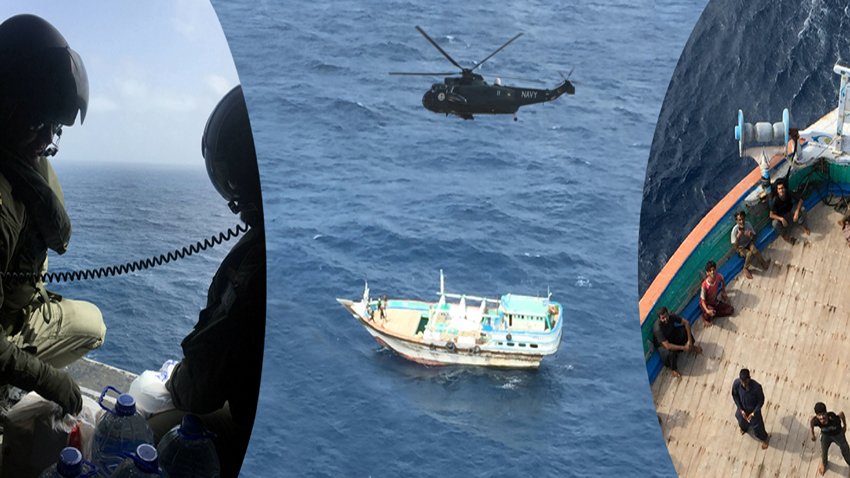 Pakistan Navy helicopter provided assistance to stranded Iranian Dhow in North Arabian Sea. Upon receipt of information of distressed Dhow 'Al Naeemi' bearing Irani flag with 13 people & crew members onboard, Pakistan Navy promptly responded & launched search & rescue operation.pic.twitter.com/kOWfymoq8T