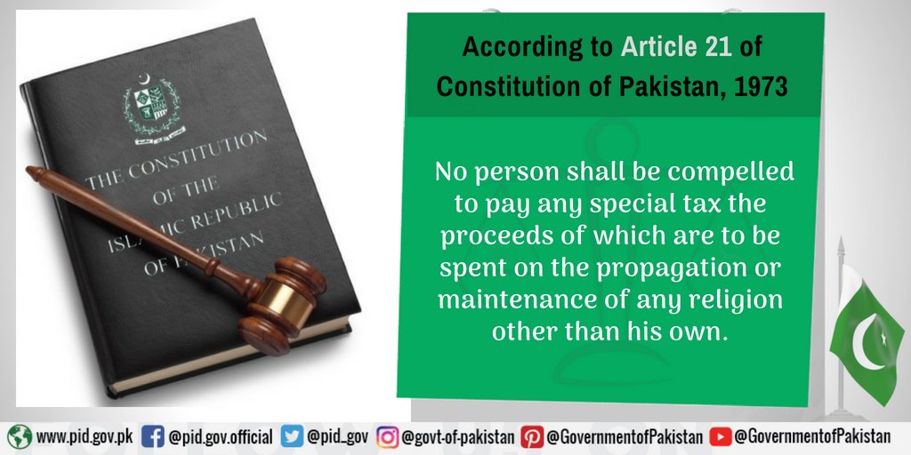 Constitution is a set of laws that establish framework for government. It sets ground rules for what kind day-to-day laws can be written. Article 21 of Constitution of Pakistan 1973 ensures Safeguard against taxation for purposes of any particular religion. #KnowYourConstitutionpic.twitter.com/MwTtYcDi9G