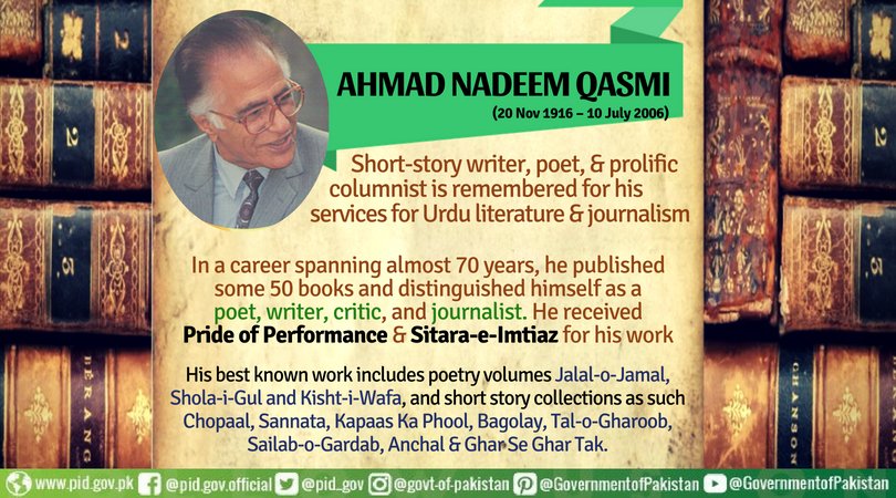Death anniversary of renowned poet and veteran literary scholar, Ahmad Nadeem Qasmi is marked across the country today. He was one of the major literary figures in the #Urdu language & produced great literature which will keep his name alive for a long time.pic.twitter.com/SmWoWYyyLM
