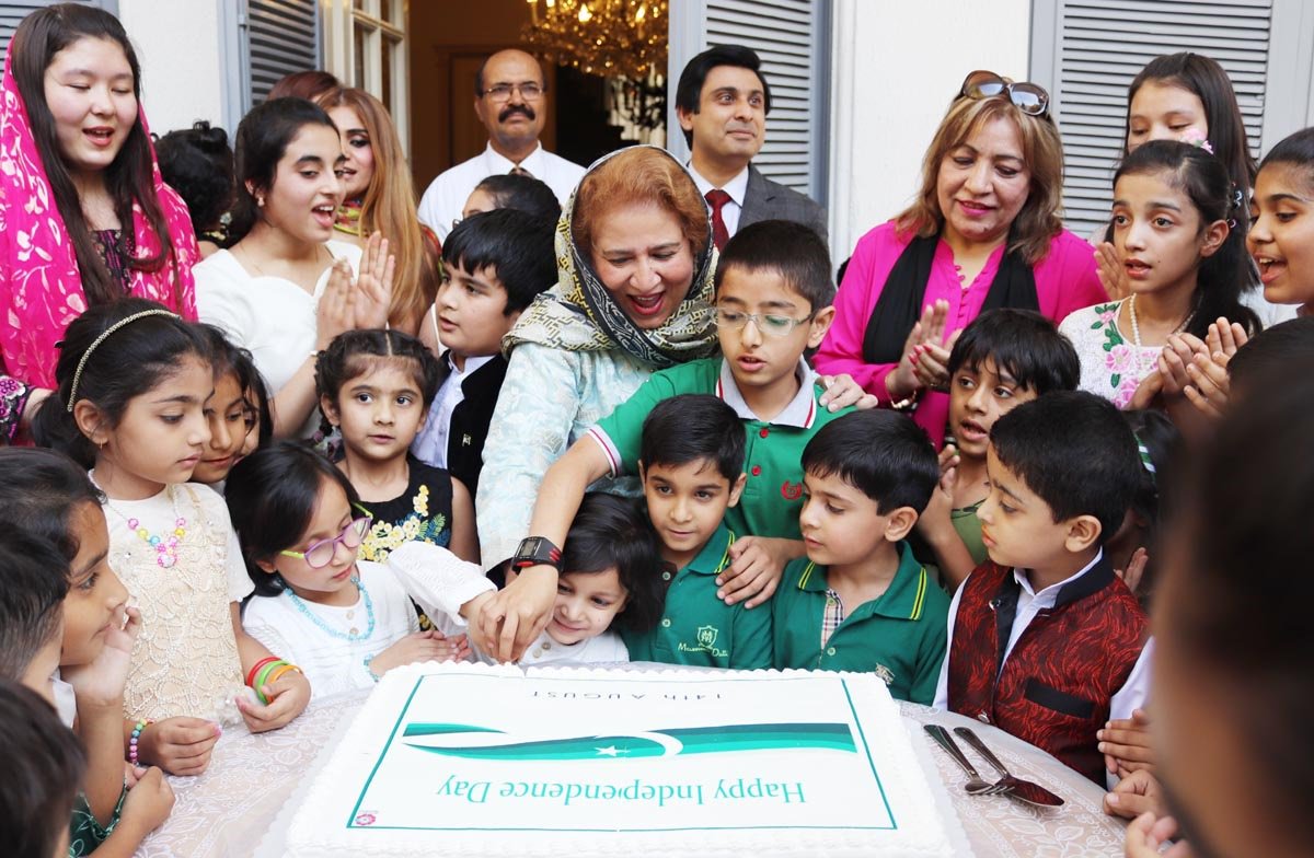 Ambassador of Pakistan to Iran Riffat Masood cutting a cake during Pakistan Independence Day ceremony in Tehran on August 14, 2018.