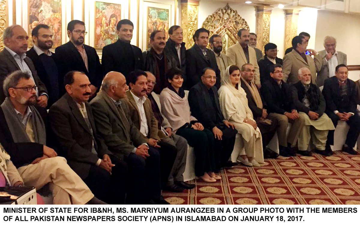 MOS for IB&NH, Ms. Marriyum Aurangzeb in a group photo with the members of All Pakistan Newspapers Society (APNS) in #Islamabadpic.twitter.com/D3sg5JE40D