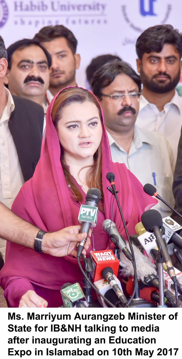 MOS IB&NH #MarriyumAurangzeb talking to media after inaugurating an Education Expo in Islamabad on 10th May 2017.pic.twitter.com/mqpdrgka9t