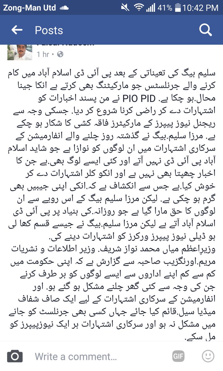 میڈم انفارمیشن کے سرکاری اشتہارات سلیم بیگ نے من پسند لوگوں کو دے کر معاشی قتل عام کیا ہے انکے خلاف کاروائی کریں اور ورکرز کو انصاف دے