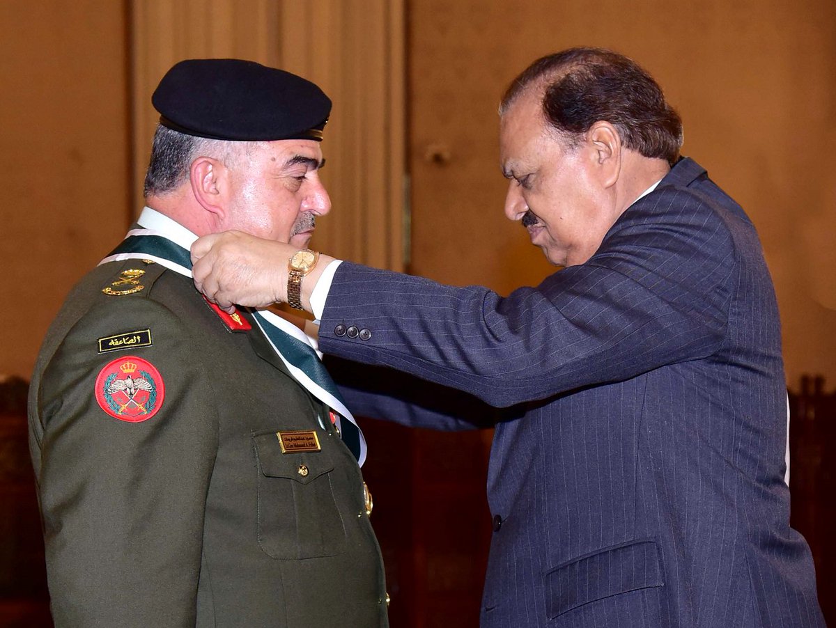 President Mamnoon Hussain conferring the award of Nishan-I-Imtiaz (Military) on Lt. General Mahmoud A. Fraihat CJCS Jordan Armed Forces.pic.twitter.com/aXBhcEZrKW