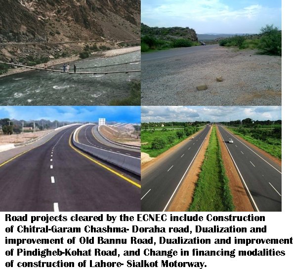 Road projects cleared by #ECNEC include Chitral-Garam Chashma- Doraha road, Old Bannu Road, Pindigheb-Kohat Road, and Lahore- Sialkot MW.pic.twitter.com/C8pLGi50oX