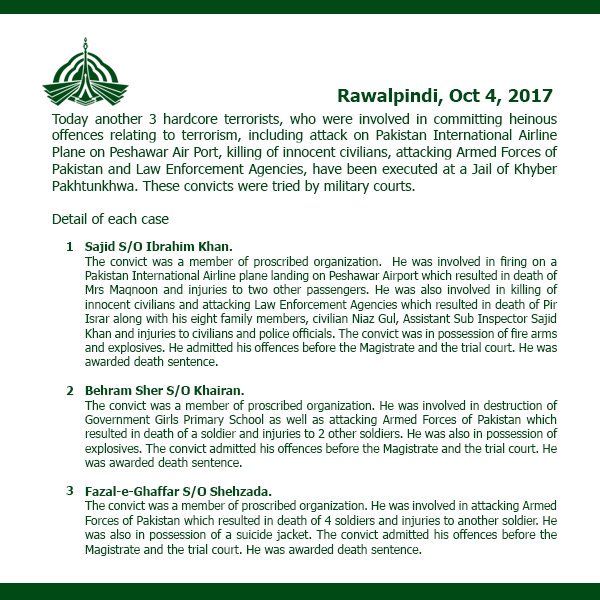 Three terrorists involved in committing heinous offenses relating to #terrorism were executed at KPK jail today.