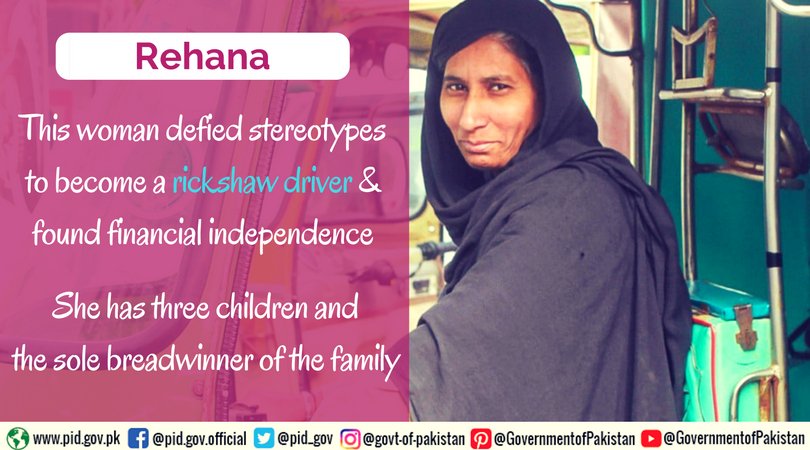 The #women in #Pakistan are defying stereotypes. Rehana, a lady from #Lahore becomes one of the first female rickshaw drivers to find financial independence.pic.twitter.com/jxeNeBsSxt