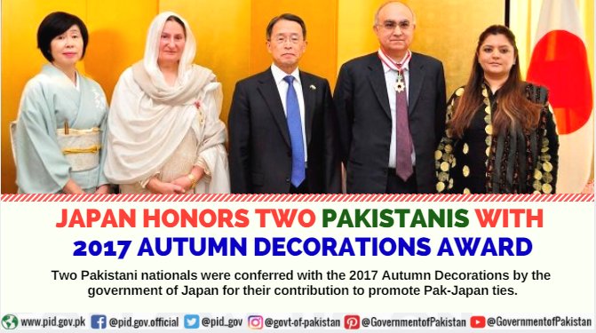 Honorary Consul General of Japan in Lahore Amir Hussain Shirazi & Pakistan-Japan Cultural Association (PJCA) President Roeeda Kabir were conferred with 2017 Autumn Decorations by Government of #Japan in recognition of their contributions to development of Pak-Japan relationspic.twitter.com/TQxOwAPJQ4