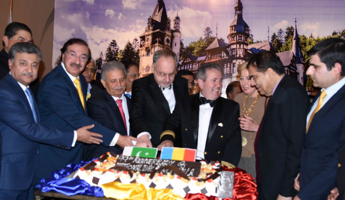 Federal Minister for Defence Production, Rana Tanveer Hussain and Ambassador of Romania H.E Mr. Nicolae Gola cutting the cake at the National Day Reception of #Romania in Islamabad.pic.twitter.com/eg9s2egR8i