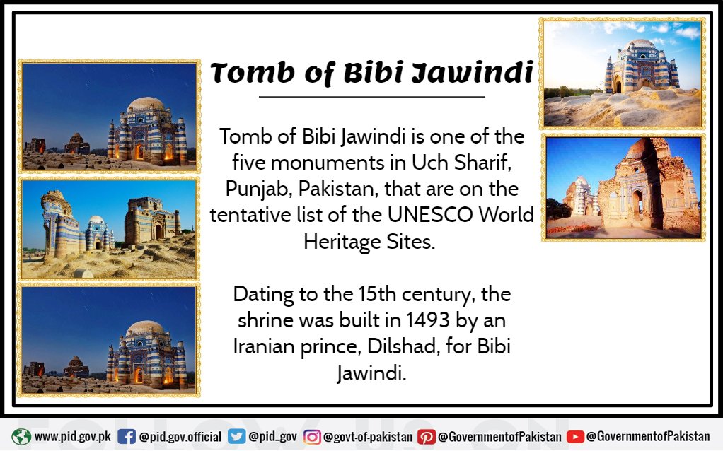 The Tomb of Bibi Jawindi is a monument in Uch Sharif which is on tentative list of the #UNESCO World #Heritage Sites. The tomb is part of the "The Uch Monuments Complex" which contains Tomb of Bibi Jawindi, Baha'al-Halim and Ustead and the Tomb and Mosque of Jalaluddin Bukhari.pic.twitter.com/ZqYHeNrnpX