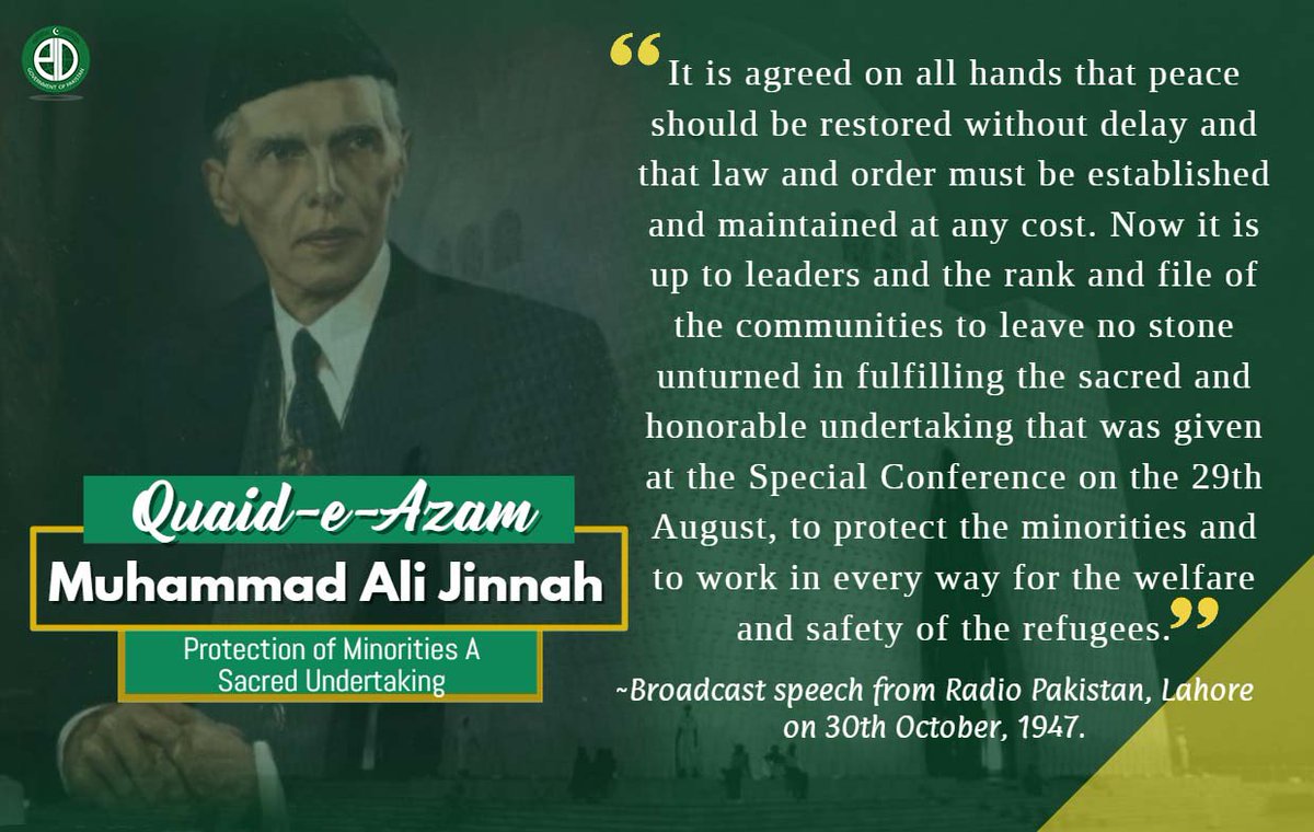 Quaid-e-Azam Muhammad Ali Jinnah envisioned of #Pakistan as a country where the rights and interests of the #minorities will be protected by the constitution and the law not only as something due to them but also as an insurance of the state’s integrity.