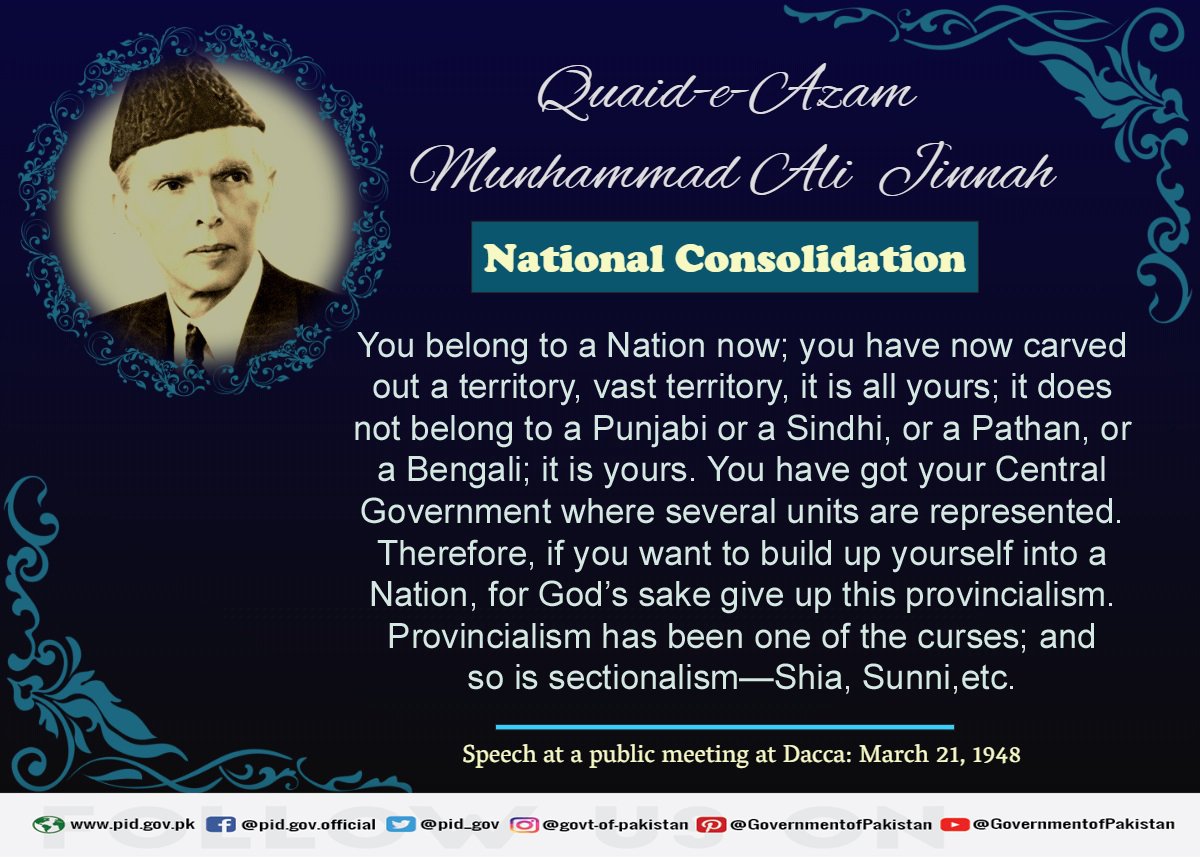 The #FounderOfPakistan #QuaidEAzam Muhammad Ali #Jinnah, blessed with strategic vision and foresight, warned his countrymen about “the curse of provincialism”, the very next year after newly independent state #Pakistan was created. #UnitedPakistan🇵🇰pic.twitter.com/dftk1PloXd