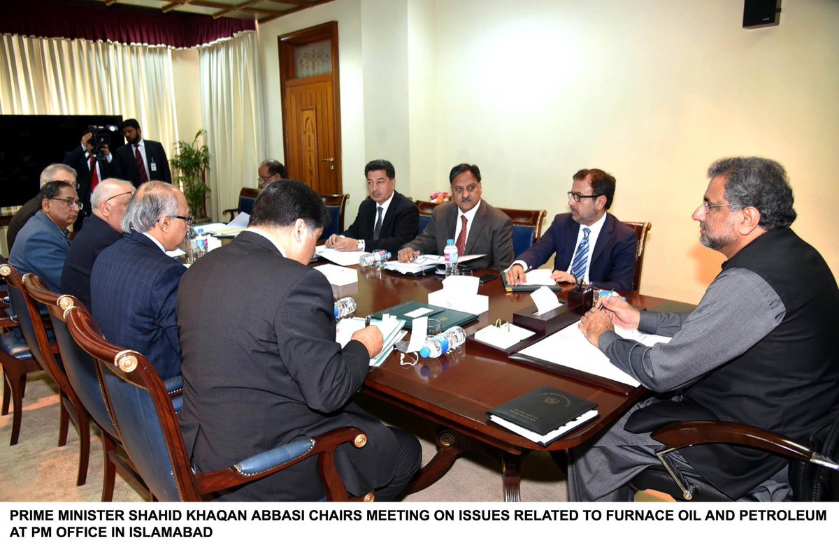 Prime Minister Shahid Khaqan Abbasi chaired a meeting to review issues related to furnace oil&petroleum. PM directed Ministry of Power & Ministry of Petroleum to ensure proper planning so as to ensure maintenance of required stocks of furnace oil to meet any emergent situation.pic.twitter.com/OEqTduFcUM