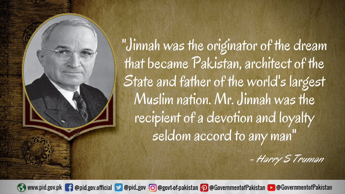 Harry S Truman (the then serving President of the #USA) remarked Jinnah as the originator of the dream that became #Pakistan and an architect of the State and father of the world’s largest #Muslim nation. #QuaidEAzam #Jinnah #HarrySTrumanpic.twitter.com/sO8h2f7Kg7