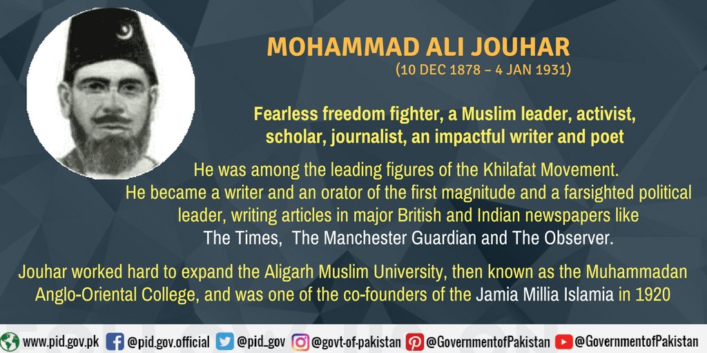 The death anniversary of Maulana Muhammad Ali Jauhar, leader of Khilafat Movement and a renowned journalist is observed today.He was a brilliant writer and orator and wrote for major English and Indian newspapers.He also launched Urdu weekly Hamdard and English Comrade in 1911.pic.twitter.com/kG6qz3mybo